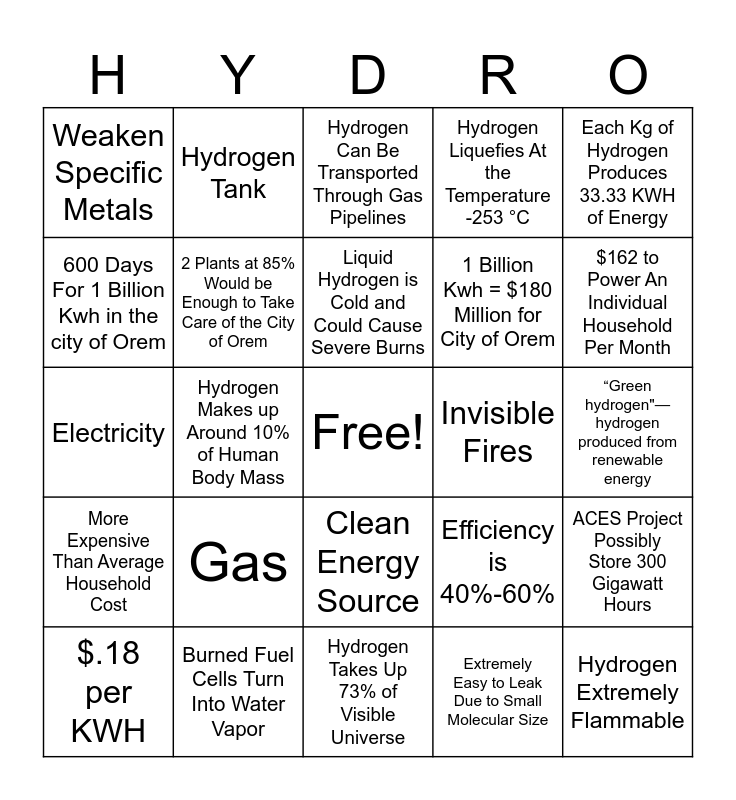This bingo card has a free space and 24 words: Gas, Burned Fuel Cells Turn Into Water Vapor, Liquid Hydrogen is Cold and Could Cause Severe Burns, $.18 per KWH, Each Kg of Hydrogen Produces 33.33 KWH of Energy, Weaken Specific Metals, 600 Days For 1 Billion Kwh in the city of Orem, Hydrogen Tank, Invisible Fires, Clean Energy Source, 1 Billion Kwh = $180 Million for City of Orem, Electricity, Efficiency is 40%-60%, ACES Project Possibly Store 300 Gigawatt Hours, 2 Plants at 85% Would be Enough to Take Care of the City of Orem, Extremely Easy to Leak Due to Small Molecular Size, “Green hydrogen"— hydrogen produced from renewable energy, Hydrogen Can Be Transported Through Gas Pipelines, $162 to Power An Individual Household Per Month, Hydrogen Makes up Around 10% of Human Body Mass, Hydrogen Extremely Flammable, More Expensive Than Average Household Cost, Hydrogen Liquefies At the Temperature -253 °C and Hydrogen Takes Up 73% of Visible Universe.