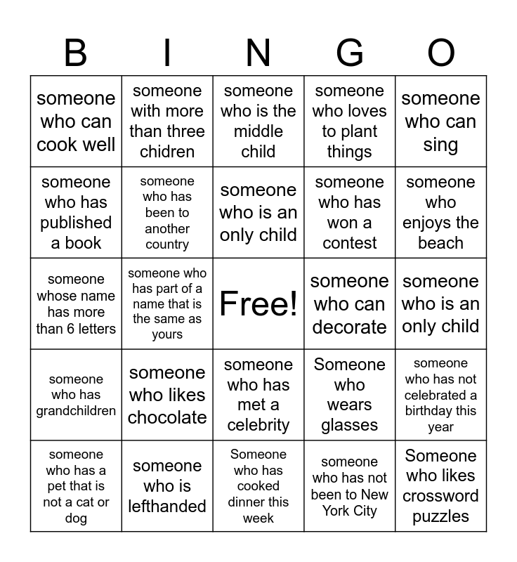 This bingo card has a free space and 24 words: someone who likes chocolate, someone who is lefthanded, someone who is an only child, someone who has a pet that is not a cat or dog, someone who can sing, someone who can cook well, someone who has published a book, someone with more than three chidren, someone who can decorate, someone who has met a celebrity, someone who has won a contest, someone whose name has more than 6 letters, Someone who wears glasses, someone who has not celebrated a birthday this year, someone who has been to another country, someone who has not been to New York City, someone who is an only child, someone who is the middle child, someone who enjoys the beach, someone who has part of a name that is the same as yours, Someone who likes crossword puzzles, someone who has grandchildren, someone who loves to plant things and Someone who has cooked dinner this week.