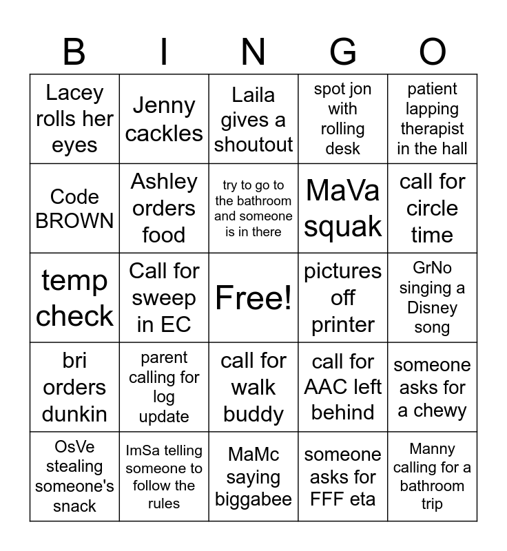 This bingo card has a free space and 29 words: OsVe stealing someone's snack, Therapist in the treehouse, Call for sweep in EC, NoBr saying HEY YOU, Lacey rolls her eyes, Laila gives a shoutout, Ashley orders food, parent calling for log update, pictures off printer, ImSa telling someone to follow the rules, GrNo singing a Disney song, Manny calling for a bathroom trip, MaMc saying biggabee, someone asks for FFF eta, call for circle time, kiddo sitting at someone else's table, call for walk buddy, bri orders dunkin, patient lapping therapist in the hall, temp check, call for AAC left behind, MaOa screaming KEAAATOONNN, MaVa squak, Code BROWN, spot jon with rolling desk, Jenny cackles, someone asks for a chewy, try to go to the bathroom and someone is in there and kiddo out of pullups in the bathroom.