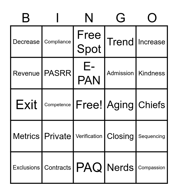 This bingo card has a free space and 25 words: Private, PAQ, E-PAN, Exclusions, Increase, Decrease, Revenue, Compliance, Aging, Verification, Admission, Exit, Closing, Sequencing, PASRR, Eligibility, Chiefs, Free Spot, Kindness, Competence, Compassion, Contracts, Metrics, Trend and Nerds.