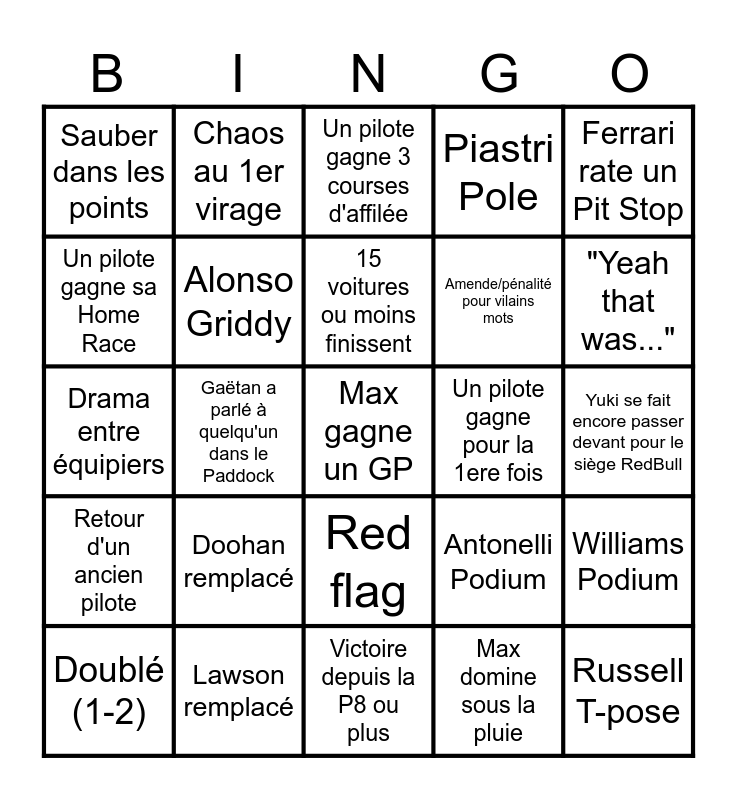 This bingo card has a free space and 24 words: Doohan remplacé, Lawson remplacé, 15 voitures ou moins finissent, Doublé (1-2), Ferrari rate un Pit Stop, Sauber dans les points, Un pilote gagne sa Home Race, Chaos au 1er virage, Un pilote gagne pour la 1ere fois, Red flag, Amende/pénalité pour vilains mots, Drama entre équipiers, Antonelli Podium, Williams Podium, Alonso Griddy, Max domine sous la pluie, Yuki se fait encore passer devant pour le siège RedBull, Un pilote gagne 3 courses d'affilée, "Yeah that was...", Gaëtan a parlé à quelqu'un dans le Paddock, Russell T-pose, Retour d'un ancien pilote, Piastri Pole and Victoire depuis la P8 ou plus.