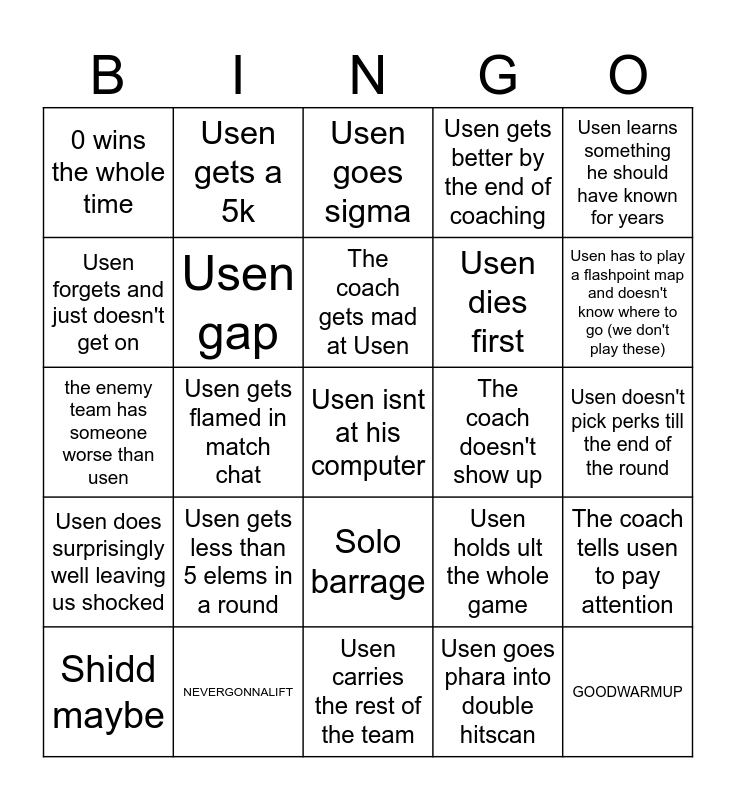 This bingo card has a free space and 24 words: Shidd maybe, Usen gets less than 5 elems in a round, The coach gets mad at Usen, Usen goes phara into double hitscan, Usen learns something he should have known for years, 0 wins the whole time, Usen gets a 5k, Usen goes sigma, The coach doesn't show up, Usen doesn't pick perks till the end of the round, the enemy team has someone worse than usen, Usen gap, Usen holds ult the whole game, The coach tells usen to pay attention, Usen forgets and just doesn't get on, NEVERGONNALIFT, Usen carries the rest of the team, Usen gets better by the end of coaching, Usen has to play a flashpoint map and doesn't know where to go (we don't play these), Usen does surprisingly well leaving us shocked, Usen gets flamed in match chat, Solo barrage, Usen dies first and GOODWARMUP.