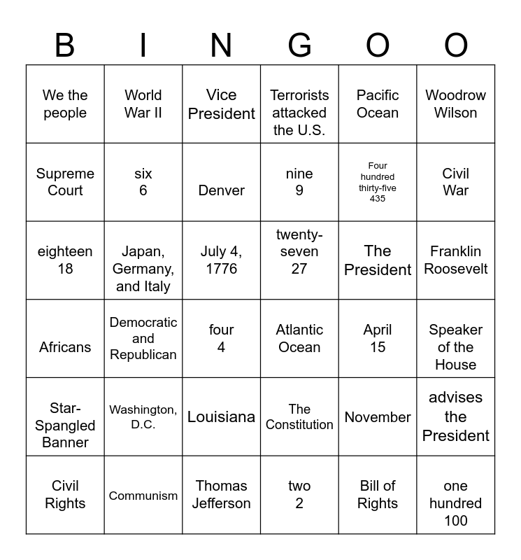 This bingo card has 36 words: The Constitution, Louisiana, two 2, Supreme Court, Africans, twenty-seven 27, six 6, Thomas Jefferson, Pacific Ocean, November, Civil War, Terrorists attacked the U.S., advises the President, Japan, Germany, and Italy, nine 9, We the people, Star-Spangled Banner, The President, eighteen 18, Vice President, July 4, 1776, Democratic and Republican, Atlantic Ocean, four 4, April 15, World War II, Four hundred thirty-five 435, Communism, Denver, Woodrow Wilson, one hundred 100, Civil Rights, Speaker of the House, Franklin Roosevelt, Washington, D.C. and Bill of Rights.