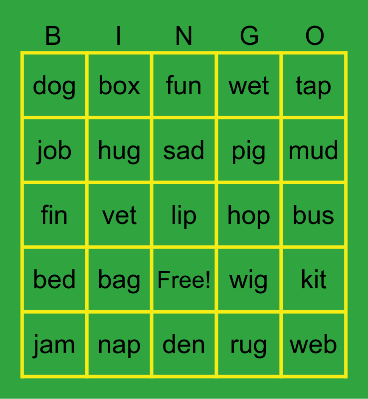 This bingo card has a free space and 24 words: bag, nap, sad, jam, tap, dog, job, box, hop, Free!, pig, fin, wig, kit, hug, rug, bus, fun, mud, vet, web, bed, wet and den.