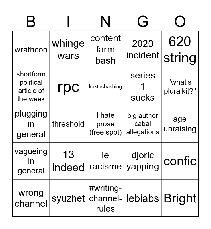 This bingo card has a free space and 24 words: 13 indeed, syuzhet, kaktusbashing, wrong channel, 620 string, wrathcon, shortform political article of the week, whinge wars, big author cabal allegations, le racisme, series 1 sucks, plugging in general, djoric yapping, confic, rpc, lebiabs, age unraising, content farm bash, "what's pluralkit?", threshold, Bright, vagueing in general, 2020 incident and #writing-channel-rules.