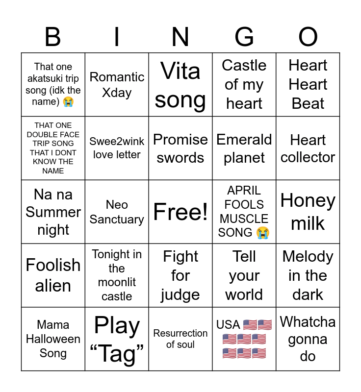 This bingo card has a free space and 24 words: Tonight in the moonlit castle, Play βTagβ, Promise swords, Mama Halloween Song, Heart Heart Beat, That one akatsuki trip song (idk the name) π, THAT ONE DOUBLE FACE TRIP SONG THAT I DONT KNOW THE NAME, Romantic Xday, APRIL FOOLS MUSCLE SONG π, Fight for judge, Emerald planet, Na na Summer night, Tell your world, Melody in the dark, Swee2wink love letter, USA πΊπΈπΊπΈπΊπΈπΊπΈπΊπΈπΊπΈπΊπΈπΊπΈ, Honey milk, Vita song, Heart collector, Neo Sanctuary, Whatcha gonna do, Foolish alien, Castle of my heart and Resurrection of soul.