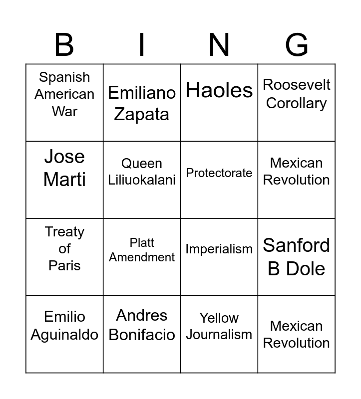 This bingo card has 19 words: Imperialism, Berlin Conference, Haoles, Mexican Revolution, Sanford B Dole, Jose Marti, Yellow Journalism, Spanish American War, Emiliano Zapata, Treaty of Paris, Platt Amendment, Queen Liliuokalani, Protectorate, Andres Bonifacio, Emilio Aguinaldo, Panama Canal, Roosevelt Corollary, Mexican Revolution and Emiliano Zapata.