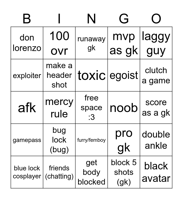 This bingo card has a free space and 24 words: bug lock (bug), friends (chatting), toxic, blue lock cosplayer, laggy guy, don lorenzo, exploiter, 100 ovr, noob, furry/femboy, egoist, afk, pro gk, double ankle, make a header shot, block 5 shots (gk), score as a gk, runaway gk, clutch a game, mercy rule, black avatar, gamepass, mvp as gk and get body blocked.