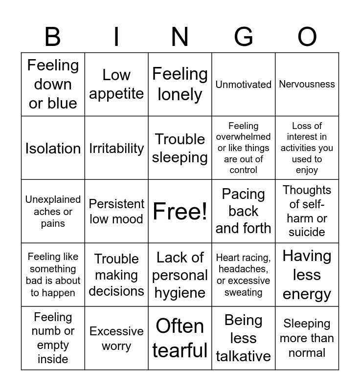 This bingo card has a free space and 24 words: Trouble making decisions, Excessive worry, Trouble sleeping, Feeling numb or empty inside, Nervousness, Feeling down or blue, Isolation, Low appetite, Pacing back and forth, Lack of personal hygiene, Feeling overwhelmed or like things are out of control, Unexplained aches or pains, Heart racing, headaches, or excessive sweating, Having less energy, Irritability, Being less talkative, Thoughts of self-harm or suicide, Feeling lonely, Loss of interest in activities you used to enjoy, Persistent low mood, Sleeping more than normal, Feeling like something bad is about to happen, Unmotivated and Often tearful.