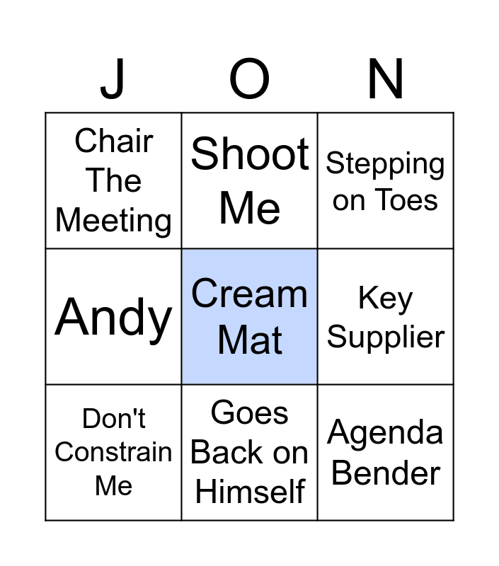 This bingo card has a free space and 8 words: Key Supplier, Stepping on Toes, Shoot Me, Don't Constrain Me, Chair The Meeting, Agenda Bender, Andy and Goes Back on Himself.