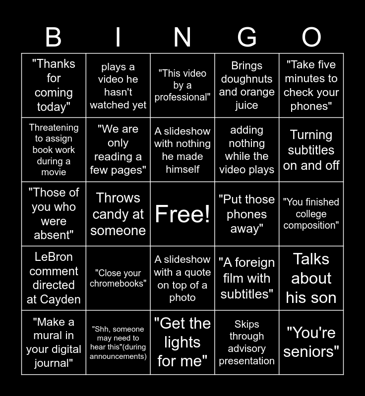 This bingo card has a free space and 39 words: Pausing a video and adding nothing, "We're watching a movie", "Open up your textbooks", "We are only reading a few pages", "Make a mural in your digital journal", A slideshow with a quote on top of a photo, A slideshow with nothing he made himself, Free time at the end of class, "Take five minutes to check your phones", LeBron comment directed at Cayden, Throws candy at someone, Brings doughnuts and orange juice, "You're seniors", "You finished college composition", "Put those phones away", "Close your chromebooks", "Open your chromebooks", "Thanks for coming today", "It's almost time to graduate", "A foreign film with subtitles", Threatening to assign book work during a movie, "Get the lights for me", adding nothing while the video plays, Turning subtitles on and off, Checking the time left on a video, Re-explaining instructions in the middle of work time, Eats yogurt, Eats granola bar, Lists everything we have done so far, plays a video he hasn't watched yet, Skips through a video, Crash Course, "This video by a professional", "Shh, someone may need to hear this"(during announcements), Skips through advisory presentation, "Take out a piece of paper", Talks about his son, "Those of you who were absent" and Re-caps a movie before we watch the second part.