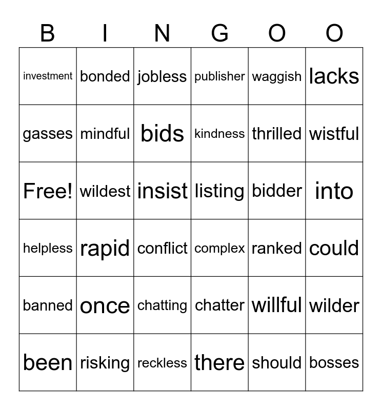 This bingo card has 36 words: chatter, chatting, there, gasses, helpless, listing, mindful, reckless, waggish, willful, wistful, publisher, wilder, wildest, kindness, investment, banned, bidder, Free!, jobless, insist, rapid, complex, conflict, ranked, bonded, thrilled, risking, bids, lacks, bosses, been, could, into, once and should.