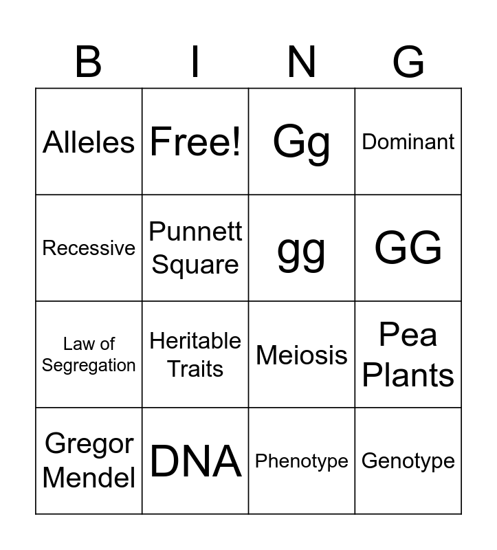 This bingo card has 19 words: Meiosis, Probability, Gg, Genotype, Pea Plants, Recessive, Phenotype, Alleles, Free!, Law of Segregation, Heritable Traits, Punnett Square, gg, DNA, Gregor Mendel, Law of Independent Assortment, Dominant, GG and Genetics.