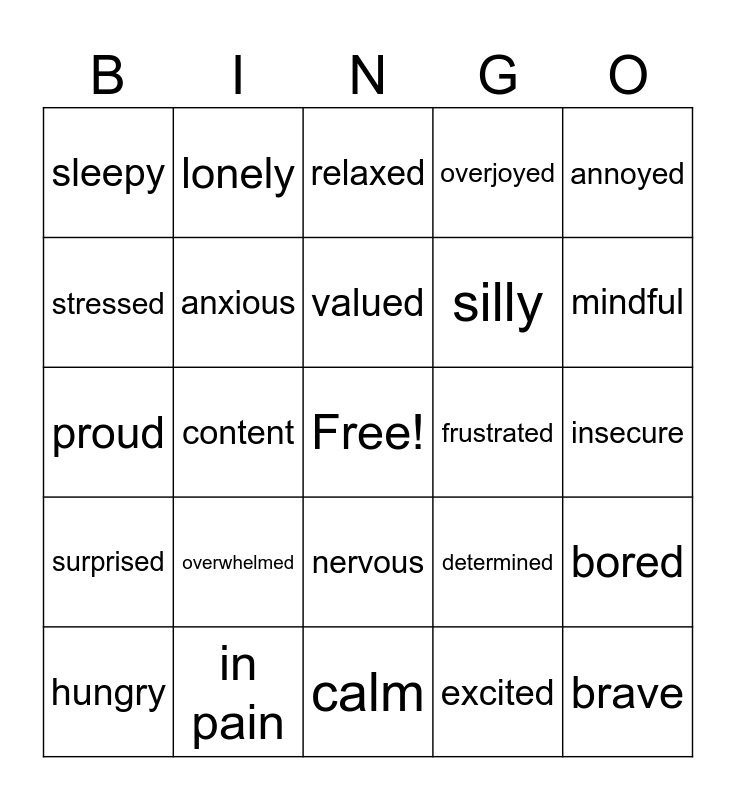 This bingo card has a free space and 29 words: hungry, sad, content, irritated, sleepy, relaxed, anxious, overwhelmed, frustrated, in pain, insecure, brave, calm, excited, mindful, peaceful, nervous, surprised, annoyed, proud, determined, delighted, silly, stressed, overjoyed, lonely, bored, valued and grateful.
