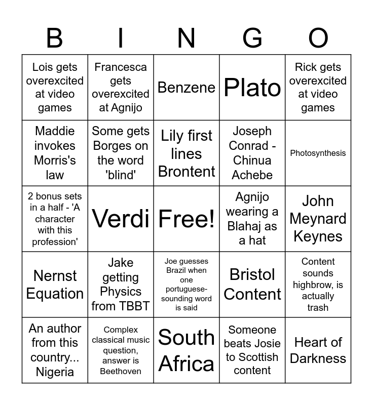 This bingo card has a free space and 24 words: Jake getting Physics from TBBT, Complex classical music question, answer is Beethoven, Lily first lines Brontent, An author from this country... Nigeria, Rick gets overexcited at video games, Lois gets overexcited at video games, Maddie invokes Morris's law, Francesca gets overexcited at Agnijo, Agnijo wearing a Blahaj as a hat, Joe guesses Brazil when one portuguese-sounding word is said, Joseph Conrad - Chinua Achebe, 2 bonus sets in a half - 'A character with this profession', Bristol Content, Content sounds highbrow, is actually trash, Some gets Borges on the word 'blind', Someone beats Josie to Scottish content, John Meynard Keynes, Benzene, Photosynthesis, Verdi, Heart of Darkness, Nernst Equation, Plato and South Africa.