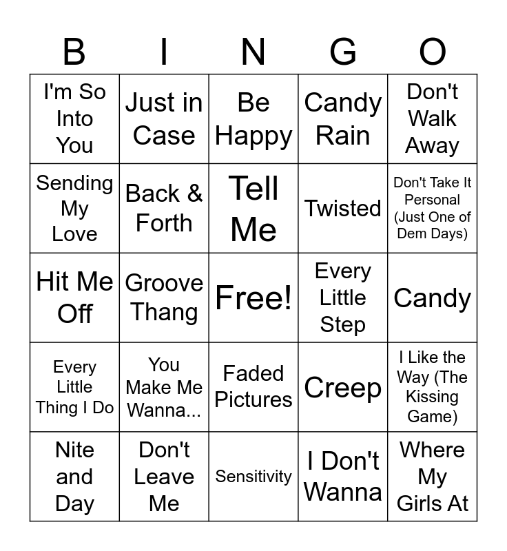 This bingo card has a free space and 36 words: Shy Guy, Back in the Day, Hey Mr. D.J., Back & Forth, Creep, Every Little Thing I Do, Tell Me, Right Here, Don't Walk Away, Real Love, Groove Thang, Candy Rain, Love Like This, Every Little Step, Don't Take It Personal (Just One of Dem Days), I'm So Into You, Top of the World, You Make Me Wanna..., Where My Girls At, Be Happy, Candy, I Like the Way (The Kissing Game), Don't Leave Me, Nite and Day, Sensitivity, Just in Case, Hit Me Off, Just Fine, Twisted, Sending My Love, Baby-Baby-Baby, Rock The Boat, I Don't Wanna, Faded Pictures, Rollout (My Business) and Hey Ya!.