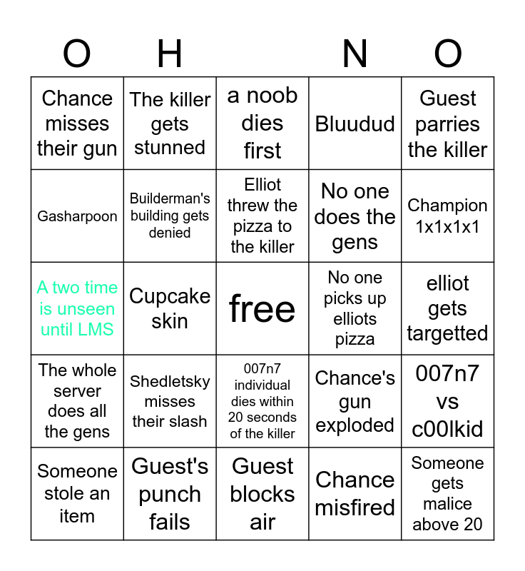This bingo card has a free space and 24 words: Shedletsky misses their slash, Guest's punch fails, Elliot threw the pizza to the killer, Someone stole an item, Guest parries the killer, Chance misses their gun, Gasharpoon, The killer gets stunned, No one picks up elliots pizza, 007n7 individual dies within 20 seconds of the killer, No one does the gens, A two time is unseen until LMS, Chance's gun exploded, 007n7 vs c00lkid, Builderman's building gets denied, Chance misfired, elliot gets targetted, a noob dies first, Champion 1x1x1x1, Cupcake skin, Someone gets malice above 20, The whole server does all the gens, Bluudud and Guest blocks air.
