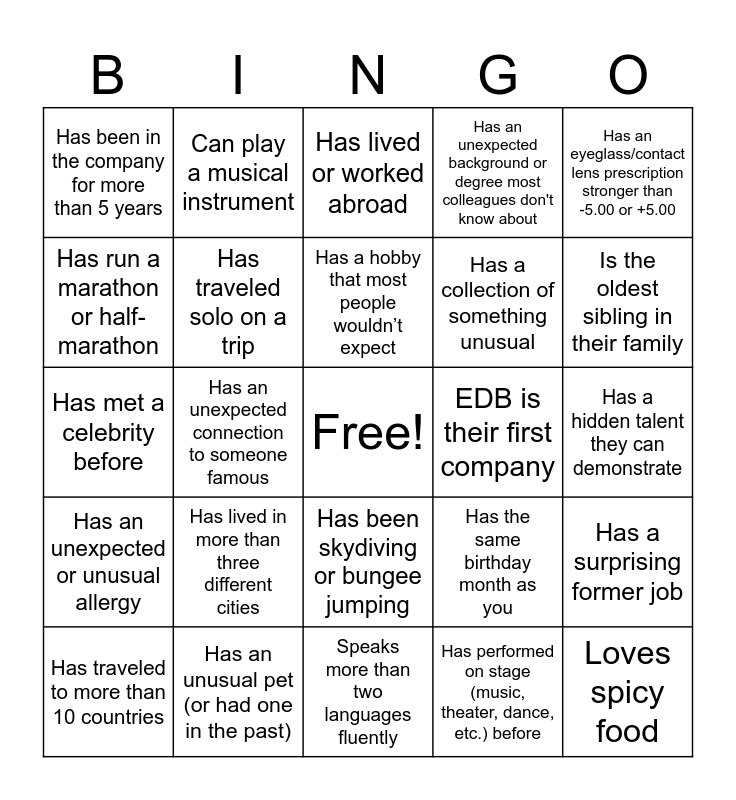 This bingo card has a free space and 25 words: Has lived in more than three different cities, Speaks more than two languages fluently, Has a hobby that most people wouldn’t expect, Has traveled to more than 10 countries, Has an eyeglass/contact lens prescription stronger than -5.00 or +5.00, Has been in the company for more than 5 years, Has run a marathon or half-marathon, Can play a musical instrument, EDB is their first company, Has been skydiving or bungee jumping, Has a collection of something unusual, Has met a celebrity before, Has the same birthday month as you, Has a surprising former job, Has traveled solo on a trip, Grows their food at home, Has a hidden talent they can demonstrate, Has lived or worked abroad, Is the oldest sibling in their family, Has an unexpected connection to someone famous, Loves spicy food, Has an unusual pet (or had one in the past), Has an unexpected or unusual allergy, Has an unexpected background or degree most colleagues don't know about and Has performed on stage (music, theater, dance, etc.) before.