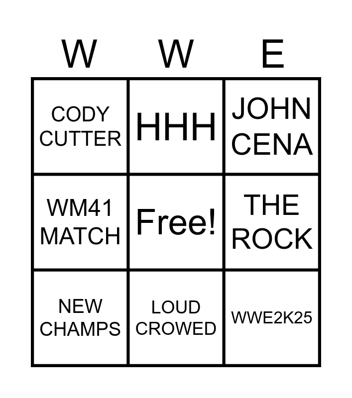 This bingo card has a free space and 8 words: THE ROCK, JOHN CENA, HHH, NEW CHAMPS, CODY CUTTER, WWE2K25, WM41 MATCH and LOUD CROWED.