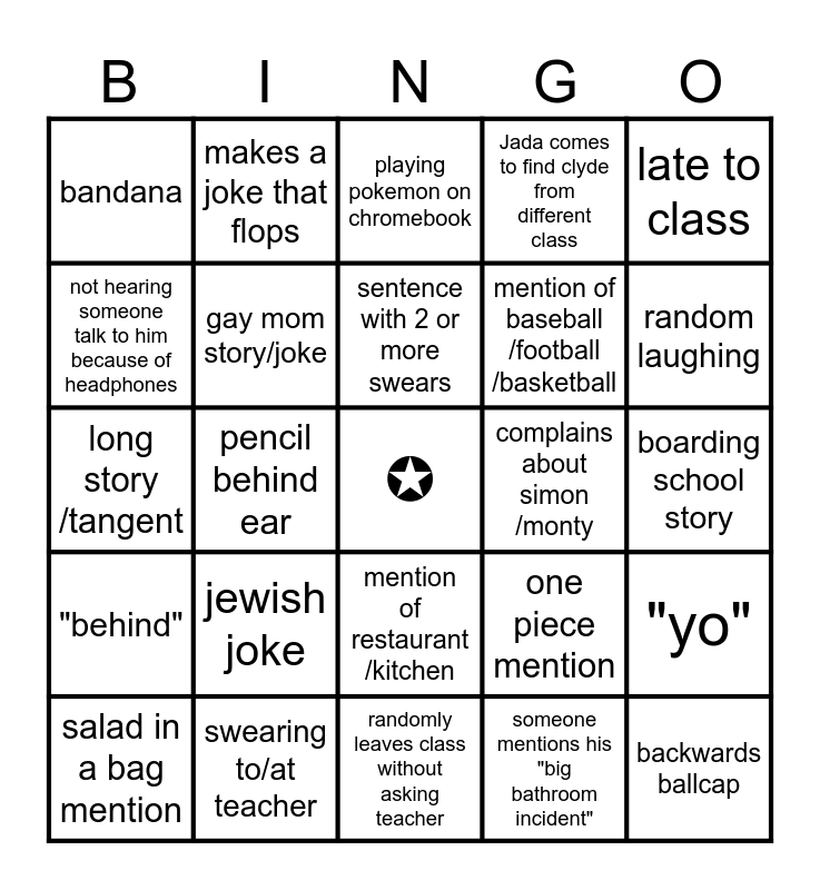 This bingo card has a free space and 24 words: jewish joke, swearing to/at teacher, sentence with 2 or more swears, salad in a bag mention, late to class, bandana, not hearing someone talk to him because of headphones, makes a joke that flops, complains about simon /monty, mention of restaurant /kitchen, mention of baseball /football /basketball, long story /tangent, one piece mention, "yo", gay mom story/joke, someone mentions his "big bathroom incident", boarding school story, playing pokemon on chromebook, random laughing, pencil behind ear, backwards ballcap, "behind", Jada comes to find clyde from different class and randomly leaves class without asking teacher.