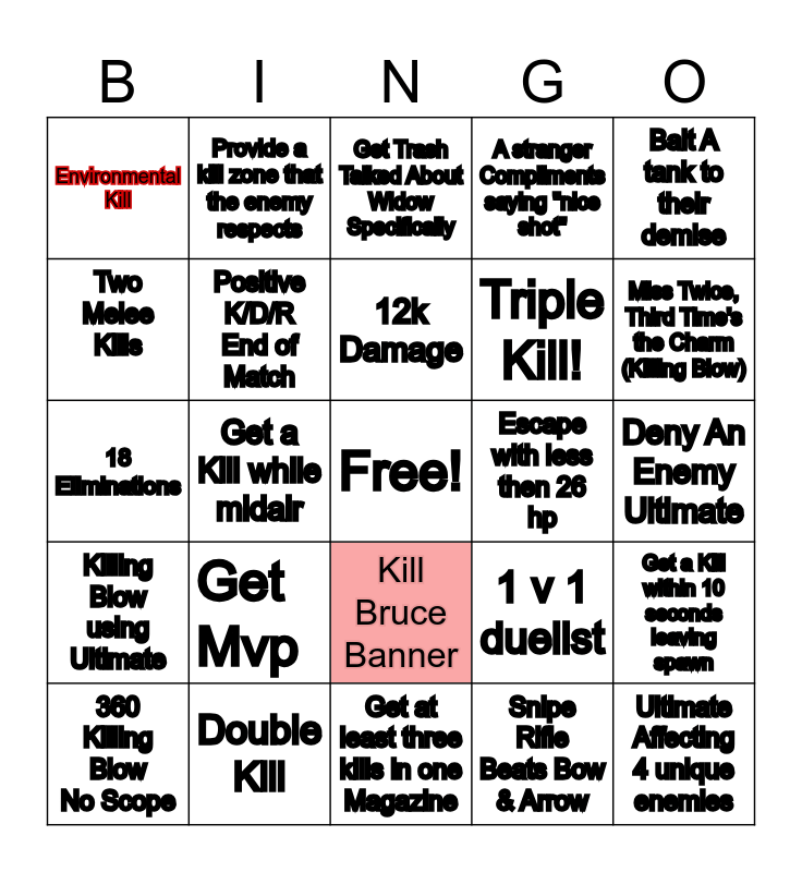 This bingo card has a free space and 24 words: Get Mvp, Double Kill, 12k Damage, 360 Killing Blow No Scope, Bait A tank to their demise, Environmental Kill, Two Melee Kills, Provide a kill zone that the enemy respects, Escape with less then 26 hp, Kill Bruce Banner, Triple Kill!, 18 Eliminations, 1 v 1 duelist, Get a Kill within 10 seconds leaving spawn, Positive K/D/R End of Match, Snipe Rifle Beats Bow & Arrow, Deny An Enemy Ultimate, Get Trash Talked About Widow Specifically, Miss Twice, Third Time's the Charm (Killing Blow), Get a Kill while midair, Ultimate Affecting 4 unique enemies, Killing Blow using Ultimate, A stranger Compliments saying "nice shot" and Get at least three kills in one Magazine.