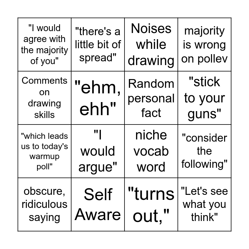 This bingo card has 16 words: Self Aware, "consider the following", Noises while drawing, "I would agree with the majority of you", "which leads us to today's warmup poll", "there's a little bit of spread", niche vocab word, "turns out,", Comments on drawing skills, "ehm, ehh", obscure, ridiculous saying, majority is wrong on pollev, "I would argue", "stick to your guns", Random personal fact and "Let's see what you think".