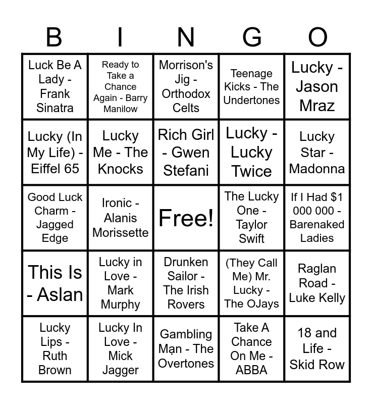 This bingo card has a free space and 96 words: Lucky - Halsey, Ain't I The Lucky One - Marty Robbins, Just Got Lucky - Jo Boxers, The Lucky One - Taylor Swift, Lucky You - Deftones, Good Day - Nappy Roots, Teir Abhaile Riu - Celtic Woman, I'm on a Roll - Stefano, You Are My Lucky Star - Sammy Davis Jr., If I'm Lucky - Jason Derulo, Salty Dog - Flogging Molly, Chances - Backstreet Boys, Another Irish Drinking Song - Da Vinci's Notebook, Lucky Star - Madonna, We All Get Lucky Sometimes - Lee Roy Parnell, Lucky (In My Life) - Eiffel 65, Rich Girl - Gwen Stefani, Lucky Girl - Carlina, Lucky Girl - Rival Sons, N17 - The Saw Doctors, Too Sweet - Hozier, Sally MacLennane - The Pógues, Get Lucky - Daft Punk, Lucky Ones - Loverboy, Drunken Sailor - The Irish Rovers, Gambling Mạn - The Overtones, Wired To The Moon - The Revs, Luck Be A Lady - Frank Sinatra, Lucky Man - The Verve, Second Chance - 38 Special, You're a Lucky Guy - Billie Holiday, (They Call Me) Mr. Lucky - The OJays, I Should Be so Lucky - Kylie Minogue, The Fields of Athenry - Paddy Reilly, Lucky - Jason Mraz, My Lucky Day - Bruce Springsteen, Raglan Road - Luke Kelly, Lucky Strike - Maroon 5, Lucky Day - Judy Garland, Ironic - Alanis Morissette, Hard Luck - Tia Brázda, Lucky Lips - Ruth Brown, 18 and Life - Skid Row, Lucky In Love - Mick Jagger, This Is - Aslan, Morrison's Jig -Orthodox Celts, Taking Chances - Céline Dion, The Auld Triangle - Punch Brothers, Lucky - Britney Spears, Sometimes You Win - CHIC, Lucky - Elle King, Luckiest Man - The Wood Brothers., Seven Drunken Nights - The Dubliners, Mr. Blue Sky - Eléctric Light Orchestra, Breakeven - The Script, Good Luck Bad Luck - Lynyrd Skynyrd, Hollywood - Thin Lizzy, The Gambler - Kenny Rogers, Lucky Lucky Me - Marvin Gaye, With Or Without You - U2, Luck - American Authors, Hard Luck Woman - KISS, The Galway Girl - Steve Earle, Nancy Mulligan - Ed Sheeran, Push My Luck - The Chainsmokers, Good Luck Charm - Elvis Presley, I Feel Lucky - Mary Chapin Carpenter, Fisherman's Blues - The Waterboys, Changing of the Seasons - Two Door Cinema Club, Take A Chance On Me - ABBA, What Are the Odds? - Alert The Medic, Lucky Day - Tom Waits, Whiskey In The Jar - Metallica, You Got Lucky - Tom Petty, Good Luck Babe! - Chappell Roan, Deja Vu - If I'm Lucky, The Rocky Road To Dublin - The High Kings, Lucky Me - The Knocks, Trying Your Luck - The Strokes, Lucky - Lucky Twice, Teenage Kicks - The Undertones, With A Little Luck - Wings, Some Guys Have All the Luck - Rod Stewart, The Night Pat Murphy Died - Great Big Sea, Dreams - The Cranberries, Good Luck Charm - Jagged Edge, Lucky in Love - Mark Murphy, Lucky Day - Louis II, Beginner's Luck - King Gizzard & The Lizard Wizard, If I Had $1 000 000 - Barenaked Ladies, Lucky Lucky Me - Marvin Gaye, Chances Are - Bob Seger, Lucky - Radiohead, Be Lucky - The Who, Ready to Take a Chance Again - Barry Manilow and Lucky - Meghan Trainor.