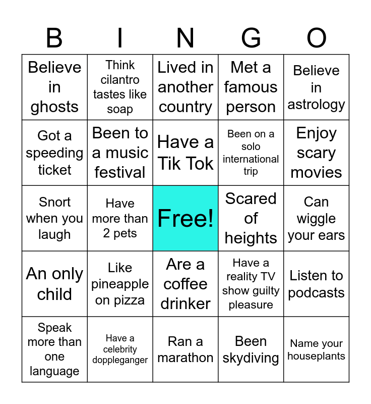 This bingo card has a free space and 29 words: Speak more than one language, Am a night owl, Have more than 2 pets, Have been on TV, Believe in ghosts, Lived in another country, Been to a music festival, Like pineapple on pizza, Scared of heights, Have a celebrity doppleganger, Can wiggle your ears, Name your houseplants, Ran a marathon, Been skydiving, Enjoy scary movies, Born in the state you currently live in, Are a coffee drinker, An only child, Believe in astrology, Snort when you laugh, Have a reality TV show guilty pleasure, Enjoy breakfast for dinner, Been on a solo international trip, Got a speeding ticket, Met a famous person, Think cilantro tastes like soap, Listen to podcasts, Have a Tik Tok and Walked out of a movie theater during a bad film.