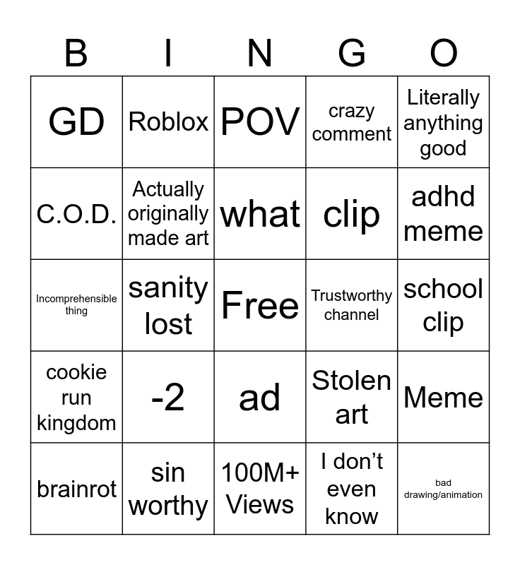 This bingo card has a free space and 24 words: -2, sin worthy, what, brainrot, Literally anything good, GD, C.O.D., Roblox, Trustworthy channel, ad, clip, Incomprehensible thing, Stolen art, Meme, Actually originally made art, I don’t even know, school clip, POV, adhd meme, sanity lost, bad drawing/animation, cookie run kingdom, crazy comment and 100M+ Views.
