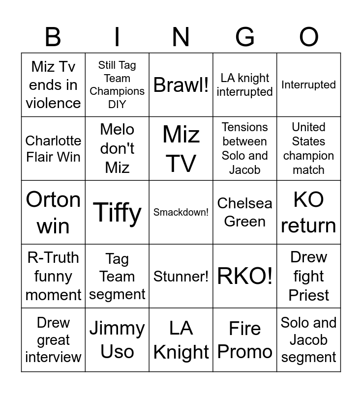 This bingo card has a free space and 24 words: Tag Team segment, Jimmy Uso, Miz TV, Drew great interview, Interrupted, Miz Tv ends in violence, Charlotte Flair Win, Still Tag Team Champions DIY, Chelsea Green, Stunner!, Tensions between Solo and Jacob, Orton win, RKO!, Drew fight Priest, Melo don't Miz, Fire Promo, KO return, Brawl!, United States champion match, Tiffy, Solo and Jacob segment, R-Truth funny moment, LA knight interrupted and LA Knight.