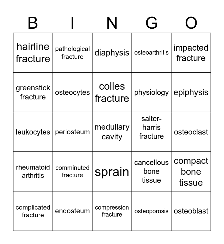This bingo card has 25 words: comminuted fracture, compression fracture, colles fracture, complicated fracture, impacted fracture, hairline fracture, greenstick fracture, pathological fracture, salter-harris fracture, sprain, physiology, leukocytes, cancellous bone tissue, compact bone tissue, osteocytes, osteoblast, osteoclast, diaphysis, epiphysis, periosteum, medullary cavity, endosteum, rheumatoid arthritis, osteoarthritis and osteoporosis.