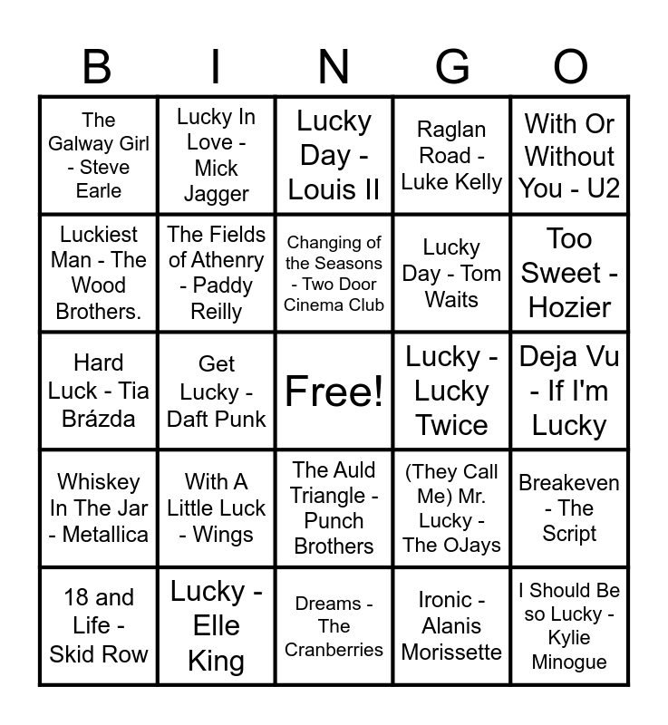 This bingo card has a free space and 97 words: Lucky - Jason Mraz, Lucky - Britney Spears, Lucky Man - The Verve, Get Lucky - Daft Punk, Good Luck Babe! - Chappell Roan, Luck Be A Lady - Frank Sinatra, Lucky - Halsey, Lucky Star - Madonna, The Lucky One - Taylor Swift, If I Had $1 000 000 - Barenaked Ladies, Good Luck Bad Luck - Lynyrd Skynyrd, Lucky Lucky Me - Marvin Gaye, Lucky - Radiohead, Whiskey In The Jar - Metallica, Seven Drunken Nights - The Dubliners, The Galway Girl - Steve Earle, With Or Without You - U2, Teir Abhaile Riu - Celtic Woman, Drunken Sailor - The Irish Rovers, Sally MacLennane - The Pógues, Teenage Kicks - The Undertones, The Rocky Road To Dublin - The High Kings, Rich Girl - Gwen Stefani, I Feel Lucky - Mary Chapin Carpenter, Salty Dog - Flogging Molly, Changing of the Seasons - Two Door Cinema Club, 18 and Life - Skid Row, Breakeven - The Script, Wired To The Moon - The Revs, Another Irish Drinking Song - Da Vinci's Notebook, The Fields of Athenry - Paddy Reilly, Raglan Road - Luke Kelly, Fisherman's Blues - The Waterboys, N17 - The Saw Doctors, Dreams - The Cranberries, The Auld Triangle - Punch Brothers, This Is - Aslan, Some Guys Have All the Luck - Rod Stewart, Hard Luck Woman - KISS, Hard Luck - Tia Brázda, If I'm Lucky - Jason Derulo, Deja Vu - If I'm Lucky, Hollywood - Thin Lizzy, Ironic - Alanis Morissette, With A Little Luck - Wings, Good Luck Charm - Elvis Presley, Lucky Lucky Me - Marvin Gaye, Chances - Backstreet Boys, Lucky - Meghan Trainor, Lucky Me - The Knocks, Lucky Day - Judy Garland, I'm on a Roll - Stefano, Good Day - Nappy Roots, Lucky in Love - Mark Murphy, Trying Your Luck - The Strokes, Luck - American Authors, Lucky Strike - Maroon 5, Lucky In Love - Mick Jagger, You Got Lucky - Tom Petty, Lucky Ones - Loverboy, Push My Luck - The Chainsmokers, My Lucky Day - Bruce Springsteen, Lucky You - Deftones, Sometimes You Win - CHIC, Lucky Girl - Rival Sons, The Gambler - Kenny Rogers, Gambling Mạn - The Overtones, Good Luck Charm - Jagged Edge, Second Chance - 38 Special, Lucky - Elle King, Lucky Day - Tom Waits, Chances Are - Bob Seger, What Are the Odds? - Alert The Medic, Take A Chance On Me - ABBA, Taking Chances - Céline Dion, Lucky (In My Life) - Eiffel 65, Ready to Take a Chance Again - Barry Manilow, Lucky Girl - Carlina, Lucky - Lucky Twice, Mr. Blue Sky - Eléctric Light Orchestra, Nancy Mulligan - Ed Sheeran, Too Sweet - Hozier, The Night Pat Murphy Died - Great Big Sea, Beginner's Luck - King Gizzard & The Lizard Wizard, Ain't I The Lucky One - Marty Robbins, You Are My Lucky Star - Sammy Davis Jr., I Should Be so Lucky - Kylie Minogue, We All Get Lucky Sometimes - Lee Roy Parnell, Just Got Lucky - Jo Boxers, Be Lucky - The Who, Lucky Day - Louis II, You're a Lucky Guy - Billie Holiday, Lucky Lips - Ruth Brown, (They Call Me) Mr. Lucky - The OJays, Luckiest Man - The Wood Brothers., Morrison's Jig -Orthodox Celts and Danny Boy - The Irish Tenors.