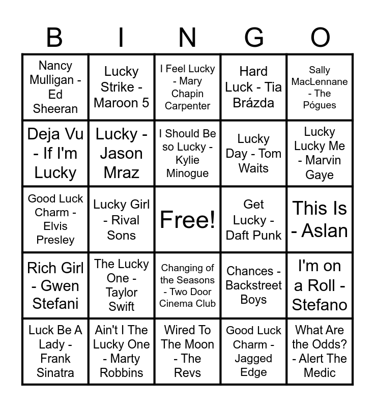 This bingo card has a free space and 97 words: Danny Boy - The Irish Tenors, Fisherman's Blues - The Waterboys, We All Get Lucky Sometimes - Lee Roy Parnell, Lucky Girl - Rival Sons, My Lucky Day - Bruce Springsteen, Luckiest Man - The Wood Brothers., Some Guys Have All the Luck - Rod Stewart, Seven Drunken Nights - The Dubliners, Teir Abhaile Riu - Celtic Woman, Taking Chances - Céline Dion, Lucky - Elle King, Lucky Lips - Ruth Brown, Lucky Star - Madonna, Rich Girl - Gwen Stefani, If I Had $1 000 000 - Barenaked Ladies, Nancy Mulligan - Ed Sheeran, Sally MacLennane - The Pógues, Lucky - Britney Spears, Whiskey In The Jar - Metallica, Good Luck Babe! - Chappell Roan, Lucky Day - Louis II, Salty Dog - Flogging Molly, Lucky - Lucky Twice, Push My Luck - The Chainsmokers, The Fields of Athenry - Paddy Reilly, I Should Be so Lucky - Kylie Minogue, Luck Be A Lady - Frank Sinatra, I'm on a Roll - Stefano, The Rocky Road To Dublin - The High Kings, Breakeven - The Script, Lucky - Jason Mraz, Hard Luck - Tia Brázda, Mr. Blue Sky - Eléctric Light Orchestra, The Gambler - Kenny Rogers, Wired To The Moon - The Revs, Changing of the Seasons - Two Door Cinema Club, You're a Lucky Guy - Billie Holiday, With Or Without You - U2, Beginner's Luck - King Gizzard & The Lizard Wizard, Good Luck Charm - Elvis Presley, The Auld Triangle - Punch Brothers, This Is - Aslan, Teenage Kicks - The Undertones, Good Luck Charm - Jagged Edge, The Lucky One - Taylor Swift, Another Irish Drinking Song - Da Vinci's Notebook, Take A Chance On Me - ABBA, 18 and Life - Skid Row, Ironic - Alanis Morissette, Second Chance - 38 Special, Dreams - The Cranberries, Lucky In Love - Mick Jagger, Lucky You - Deftones, Just Got Lucky - Jo Boxers, N17 - The Saw Doctors, Gambling Mạn - The Overtones, Sometimes You Win - CHIC, Lucky Strike - Maroon 5, Lucky Me - The Knocks, Too Sweet - Hozier, Lucky Man - The Verve, (They Call Me) Mr. Lucky - The OJays, Good Day - Nappy Roots, Lucky - Halsey, Lucky (In My Life) - Eiffel 65, Chances Are - Bob Seger, Trying Your Luck - The Strokes, Lucky in Love - Mark Murphy, If I'm Lucky - Jason Derulo, Ain't I The Lucky One - Marty Robbins, Lucky Day - Tom Waits, Lucky Lucky Me - Marvin Gaye, Morrison's Jig -Orthodox Celts, Raglan Road - Luke Kelly, Lucky Girl - Carlina, Hollywood - Thin Lizzy, You Are My Lucky Star - Sammy Davis Jr., Ready to Take a Chance Again - Barry Manilow, Get Lucky - Daft Punk, Good Luck Bad Luck - Lynyrd Skynyrd, Be Lucky - The Who, Lucky Lucky Me - Marvin Gaye, Lucky - Radiohead, Lucky - Meghan Trainor, The Galway Girl - Steve Earle, Luck - American Authors, What Are the Odds? - Alert The Medic, Hard Luck Woman - KISS, Lucky Ones - Loverboy, Drunken Sailor - The Irish Rovers, I Feel Lucky - Mary Chapin Carpenter, With A Little Luck - Wings, The Night Pat Murphy Died - Great Big Sea, Chances - Backstreet Boys, Deja Vu - If I'm Lucky, You Got Lucky - Tom Petty and Lucky Day - Judy Garland.