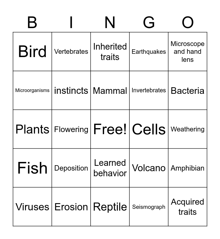 This bingo card has a free space and 24 words: Viruses, Deposition, Mammal, Seismograph, Microscope and hand lens, Bird, Vertebrates, Inherited traits, Cells, Weathering, Plants, instincts, Volcano, Amphibian, Microorganisms, Erosion, Reptile, Earthquakes, Bacteria, Fish, Flowering, Learned behavior, Invertebrates and Acquired traits.