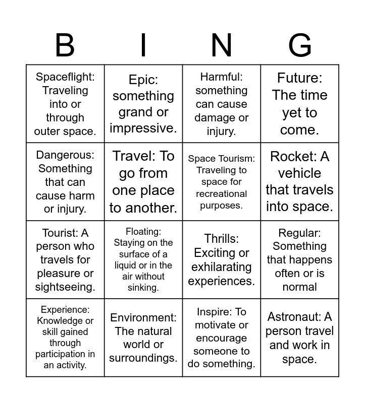 This bingo card has 20 words: Regular: Something that happens often or is normal, Adventure: An exciting journey or experience, Harmful: something can cause damage or injury., Space: The area beyond Earth's atmosphere., Experience: Knowledge or skill gained through participation in an activity., Dangerous: Something that can cause harm or injury., Environment: The natural world or surroundings., Spaceflight: Traveling into or through outer space., Tourist: A person who travels for pleasure or sightseeing., Epic: something grand or impressive., Floating: Staying on the surface of a liquid or in the air without sinking., Thrills: Exciting or exhilarating experiences., Travel: To go from one place to another., Astronaut: A person travel and work in space., Space Tourism: Traveling to space for recreational purposes., Designs: Plans or drawings for creating something., Rocket: A vehicle that travels into space., Future: The time yet to come., Inspire: To motivate or encourage someone to do something. and Gravity: The force that pulls objects toward the Earth..