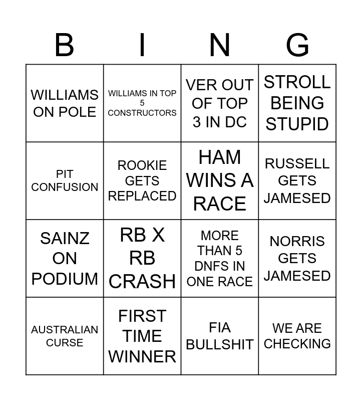 This bingo card has 16 words: FIRST TIME WINNER, NORRIS GETS JAMESED, VER OUT OF TOP 3 IN DC, WILLIAMS ON POLE, SAINZ ON PODIUM, WILLIAMS IN TOP 5 CONSTRUCTORS, MORE THAN 5 DNFS IN ONE RACE, FIA BULLSHIT, PIT CONFUSION, ROOKIE GETS REPLACED, AUSTRALIAN CURSE, STROLL BEING STUPID, RB X RB CRASH, RUSSELL GETS JAMESED, HAM WINS A RACE and WE ARE CHECKING.