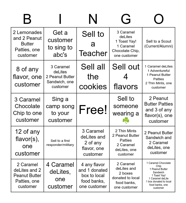 This bingo card has a free space and 24 words: Sell to a first responder/military, 4 Caramel deLites, one customer, Sell all the cookies, 2 Caramel deLites and 2 Peanut Butter Patties, one customer, Sell to a Scout (Current/Alumni), 2 Lemonades and 2 Peanut Butter Patties, one customer, 8 of any flavor, one customer, Get a customer to sing to abc's, Sell to someone wearing a ☘️, 3 Caramel deLites and 2 of any flavor, one customer, Sell out 4 flavors, 3 Caramel Chocolate Chip to one customer, 2 Thin Mints 2 Peanut Butter Patties 2 Caramel deLites, one customer, 2 Peanut Butter Sandwich and 2 Caramel deLites, one customer, 3 Caramel deLites 2 Peanut Butter Sandwich, one customer, 2 Caramel deLites and 2 boxes donated to local food banks, one customer, 2 Peanut Butter Patties and 3 of any flavor(s), one customer, Sell to a Teacher, 1 Caramel deLites 1 Adventureful 1 Peanut Butter Patties 2 Thin Mints, one customer, Sing a camp song to your customer, 1 Caramel Chocolate Chip 1 Peanut Butter Sandwich 1 Toast Yay! 1 Caramel deLite 1 box donated to local food banks, one customer, 12 of any flavor(s), one customer, 3 Caramel deLites 1 Toast Yay! 1 Caramel Chocolate Chip, one customer and 4 any flavor and 1 donated box to local food banks, one customer.