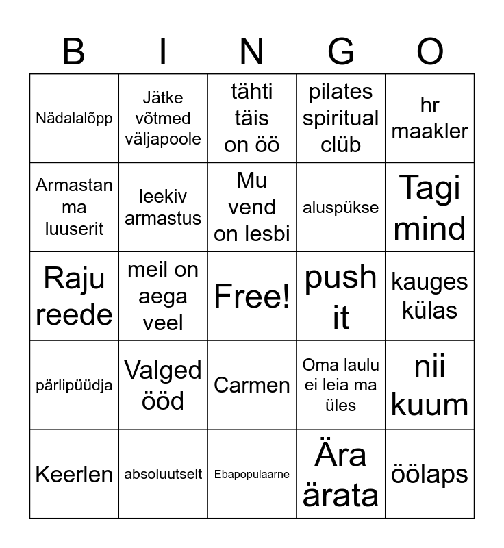 This bingo card has a free space and 25 words: Valged ööd, Ebapopulaarne, Mu vend on lesbi, Keerlen, hr maakler, Nädalalõpp, Armastan ma luuserit, Jätke võtmed väljapoole, push it, Carmen, aluspükse, Raju reede, Oma laulu ei leia ma üles, nii kuum, leekiv armastus, kesköödisko, kauges külas, tähti täis on öö, Tagi mind, meil on aega veel, öölaps, absoluutselt, pärlipüüdja, pilates spiritual clüb and Ära ärata.