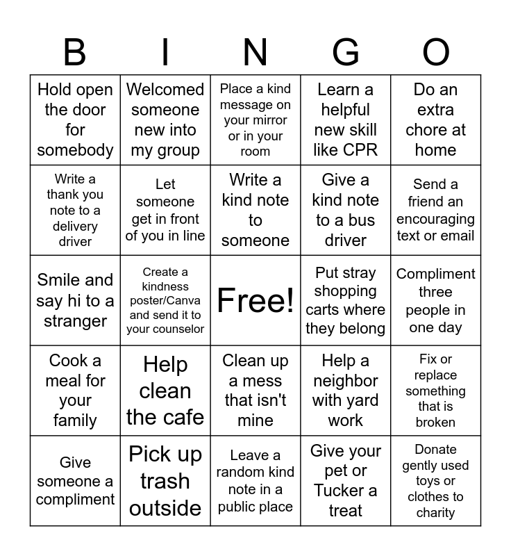 This bingo card has a free space and 24 words: Help clean the cafe, Pick up trash outside, Write a kind note to someone, Give someone a compliment, Do an extra chore at home, Hold open the door for somebody, Write a thank you note to a delivery driver, Welcomed someone new into my group, Put stray shopping carts where they belong, Clean up a mess that isn't mine, Give a kind note to a bus driver, Smile and say hi to a stranger, Help a neighbor with yard work, Fix or replace something that is broken, Let someone get in front of you in line, Give your pet or Tucker a treat, Compliment three people in one day, Place a kind message on your mirror or in your room, Send a friend an encouraging text or email, Create a kindness poster/Canva and send it to your counselor, Donate gently used toys or clothes to charity, Cook a meal for your family, Learn a helpful new skill like CPR and Leave a random kind note in a public place.