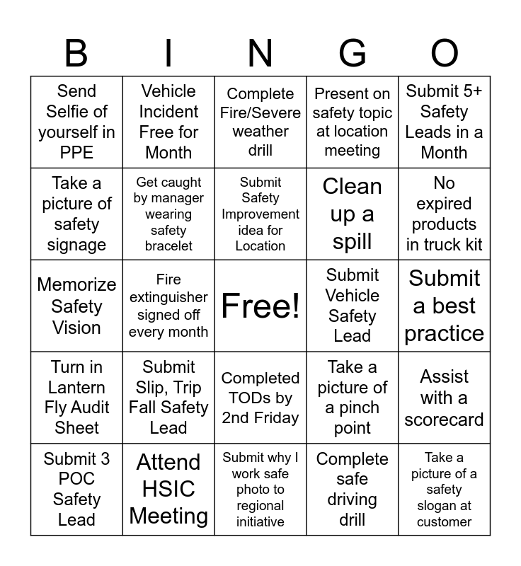 This bingo card has a free space and 24 words: Submit Slip, Trip Fall Safety Lead, Attend HSIC Meeting, Submit Safety Improvement idea for Location, Submit 3 POC Safety Lead, Submit 5+ Safety Leads in a Month, Send Selfie of yourself in PPE, Take a picture of safety signage, Vehicle Incident Free for Month, Submit Vehicle Safety Lead, Completed TODs by 2nd Friday, Clean up a spill, Memorize Safety Vision, Take a picture of a pinch point, Assist with a scorecard, Get caught by manager wearing safety bracelet, Complete safe driving drill, Submit a best practice, Complete Fire/Severe weather drill, No expired products in truck kit, Fire extinguisher signed off every month, Take a picture of a safety slogan at customer, Turn in Lantern Fly Audit Sheet, Present on safety topic at location meeting and Submit why I work safe photo to regional initiative.