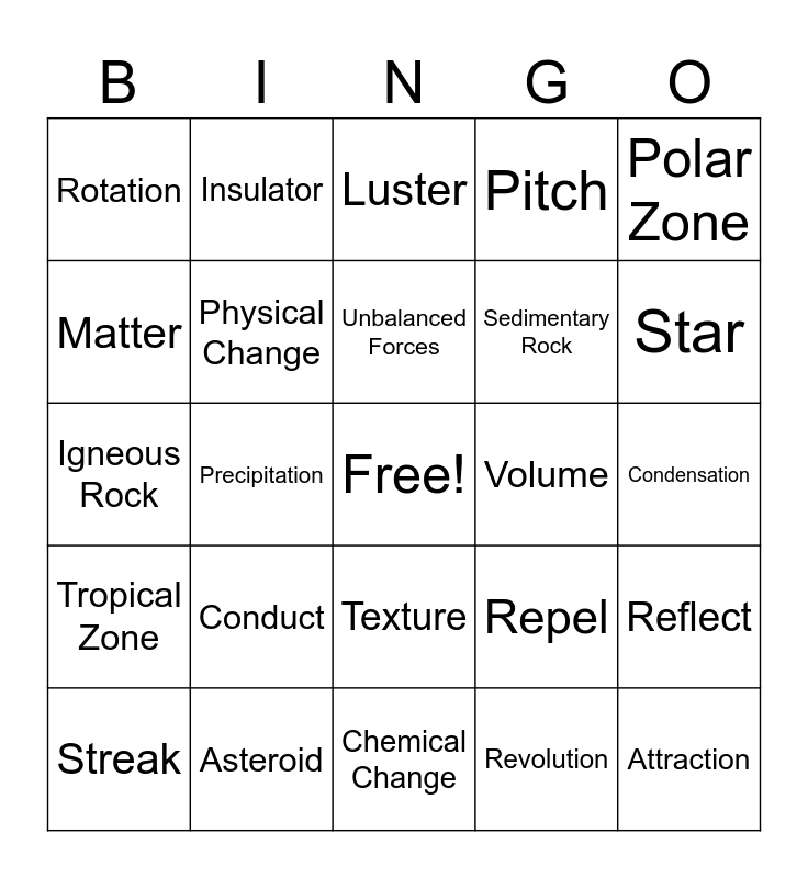 This bingo card has a free space and 49 words: Absorb, Attraction, Balanced Forces, Chemical Change, Conduct, Force Friction, Insulator, Mass, Matter, Mechanical Energy, Physical Change, Pitch, Reflect, Repel, Speed, State of Matter, Unbalanced Forces, Volume, Weight, Polar Zone, Precipitation, Revolution, Rotation, Sedimentary Rock, Solar System, Star, Streak, Temperate Zone, Texture, Tropical Zone, Water Cycle, Water Vapor, Weather, Weathering, Asteroid, Cleavage, Climate, Comet, Condensation, Erosion, Evaporation, Hardness, Hemisphere, Humidity, Igneous Rock, Luster, Metamorphic Rock, Mineral and Moon and Planet.