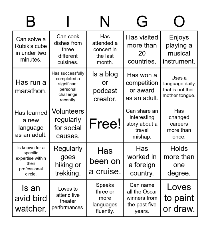 This bingo card has a free space and 45 words: Enjoys gardening or growing plants., Loves to paint or draw., Practices yoga regularly., Is an avid bird watcher., Participates in cosplay events., Can name all the Oscar winners from the past five years., Has attended a concert in the last month., Is a huge fan of a television series and has watched every episode., Enjoys playing a musical instrument., Loves to attend live theater performances., Has visited more than 20 countries., Can share an interesting story about a travel mishap., Has been on a cruise., Regularly goes hiking or trekking., Loves road trips and has traveled across the country., Speaks three or more languages fluently., Can say "hello" in more than five languages., Has learned a new language as an adult., Loves learning about etymology and the origins of words., Uses a language daily that is not their mother tongue., Can cook dishes from three different cuisines., Knows how to code in more than one programming language., Is proficient in a martial art., Can solve a Rubik’s cube in under two minutes., Enjoys woodworking or carpentry., Has changed careers more than once., Works in a non-profit organization., Has started their own business., Has worked in a foreign country., Is known for a specific expertise within their professional circle., Has studied abroad., Holds more than one degree., Was a student leader in college/university., Has taken online courses for personal growth., Is currently pursuing further educational qualifications., Volunteers regularly for social causes., Enjoys collecting specific items (like coins, stamps, etc.)., Has a pet with a unique trait., Loves doing DIY projects at home., Is a blog or podcast creator., Has run a marathon., Has won a competition or award as an adult., Has published a book or articles in major publications., Has successfully completed a significant personal challenge recently. and Actively practices mindfulness or meditation..
