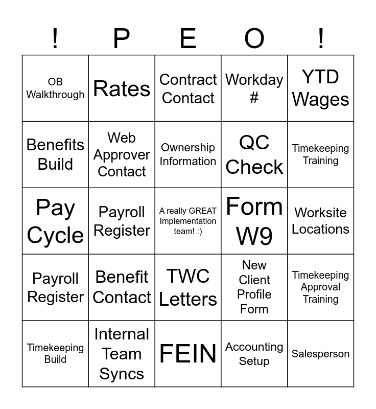 This bingo card has a free space and 57 words: Check Charge, Timekeeping Build, Form W9, OB Walkthrough, FEIN, Manager Access Forms, Web Approver Contact, Mod Search, QC Check, OB Spreadsheet, Workday #, 401k Setup, OB Spreadsheet, Ownership Information, Extra Forms, Setup Fee, YTD Wages, Payroll Register, Billing Rules, Salesperson, Form W9, E-Verify, New Client Profile Form, Contract Contact, Manager Access Forms, Ownership Information, Handbook, Extra Forms, Timekeeping Training, Kick Off Call, Signed Contract, Work Day #, Benefit Quote, IRS Letters, Worksite Locations, Benefits Build, ACH Information, Pay Cycle, Implementation Timeline, Payroll Register, Rates, TWC Letters, Cost Centers, Client, Accountint Contact, Entity Type, Benefit Contact, Internal Team Syncs, Payroll Contact, 401k Plan Survey, Good Faith Check, Accounting Setup, Timekeeping Discovery, Mock Payroll, Payroll Approval Training, Timekeeping Approval Training and Prism Build.