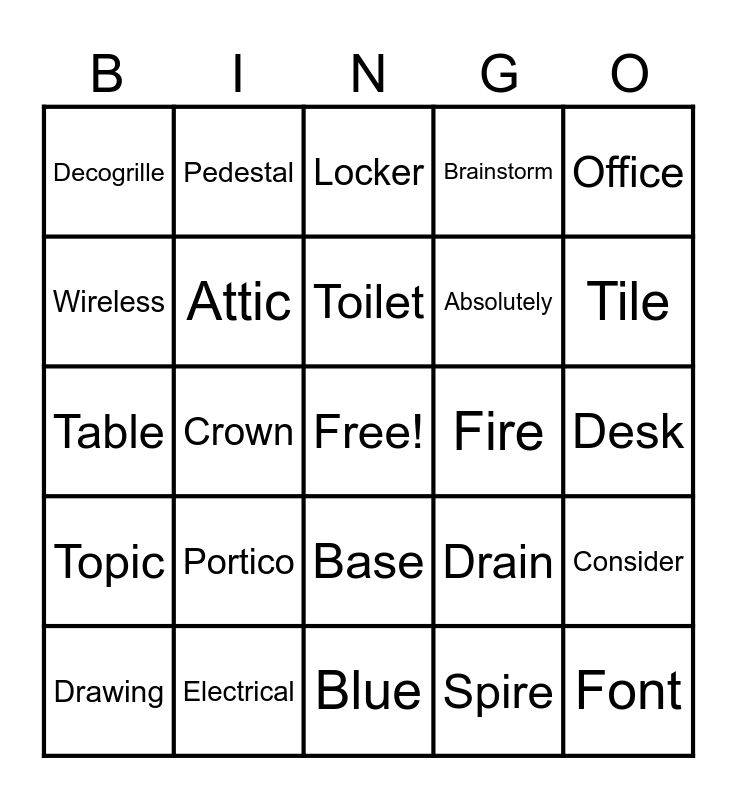 This bingo card has a free space and 396 words: Canopy, Frieze, Pedestal, Plumbing, Mechanical, Electrical, Interior, Architecture, Brainstorm, Today, Meeting, Business, Agenda, Red, Blue, Yellow, Green, Question, Answer, Cold, Hot, Meeting, Decide, Email, Thoughts, Absolutely, No, Yes, Agreed, Consider, Go ahead, Sorry, Review, Approve, Room, Baptistry, Font, Lighting, Outlet, Decogrille, Decolight, Office, Desk, Drains, Door, Window, Sealing, Partition, Sink, Portico, Laundry, Confirmation, Altar, Section, Elevation, Plan, Drawing, Conduit, Modules, Break, Proportion, Wireless, Crawl, Drain, Toilet, Structural, Topic, Thanks, Toggle, Option, Enclosed, Tile, Carpet, Initiatory, Concrete, Slab, Column, Equipment, Rug, Contemporary, Transitional, Traditional, Fire, AV, Data, ADA, Code, GFRG, GFRC, Spire, Crown, Base, Table, Casework, Cart, Egress, Attic, Locker, Pew, Brainstorm, Today, Meeting, Business, Agenda, Red, Blue, Yellow, Green, Question, Answer, Cold, Hot, Meeting, Decide, Email, Thoughts, Absolutely, No, Yes, Agreed, Consider, Go ahead, Sorry, Review, Approve, Room, Baptistry, Font, Lighting, Outlet, Decogrille, Decolight, Office, Desk, Drains, Door, Window, Sealing, Partition, Sink, Portico, Laundry, Confirmation, Altar, Section, Elevation, Plan, Drawing, Conduit, Modules, Break, Proportion, Wireless, Crawl, Drain, Toilet, Structural, Topic, Thanks, Toggle, Option, Enclosed, Tile, Carpet, Initiatory, Concrete, Slab, Column, Equipment, Rug, Contemporary, Transitional, Traditional, Fire, AV, Data, ADA, Code, GFRG, GFRC, Spire, Crown, Base, Table, Casework, Cart, Egress, Attic, Locker, Pew, Canopy, Frieze, Pedestal, Plumbing, Mechanical, Electrical, Interior, Architecture, Answer, Cold, Hot, Meeting, Decide, Email, Thoughts, Absolutely, No, Yes, Agreed, Consider, Go ahead, Sorry, Review, Approve, Room, Baptistry, Font, Lighting, Outlet, Decogrille, Decolight, Office, Desk, Drains, Door, Window, Sealing, Partition, Sink, Portico, Laundry, Confirmation, Altar, Section, Elevation, Plan, Brainstorm, Today, Meeting, Business, Agenda, Red, Blue, Yellow, Green, Question, Drawing, Conduit, Modules, Break, Proportion, Wireless, Crawl, Drain, Toilet, Structural, Topic, Thanks, Toggle, Option, Enclosed, Tile, Carpet, Initiatory, Concrete, Slab, Column, Equipment, Rug, Contemporary, Transitional, Traditional, Fire, AV, Data, ADA, Code, GFRG, GFRC, Spire, Crown, Base, Table, Casework, Cart, Egress, Attic, Locker, Pew, Canopy, Frieze, Pedestal, Plumbing, Mechanical, Electrical, Interior, Architecture, Option, Enclosed, Tile, Carpet, Initiatory, Concrete, Slab, Column, Equipment, Answer, Cold, Hot, Meeting, Decide, Email, Thoughts, Absolutely, No, Yes, Agreed, Consider, Go ahead, Sorry, Review, Approve, Room, Baptistry, Font, Lighting, Outlet, Decogrille, Decolight, Office, Desk, Drains, Door, Window, Sealing, Partition, Sink, Portico, Laundry, Confirmation, Altar, Section, Elevation, Plan, Brainstorm, Today, Meeting, Business, Agenda, Red, Blue, Yellow, Green, Question, Drawing, Conduit, Modules, Break, Proportion, Wireless, Crawl, Drain, Toilet, Structural, Topic, Thanks, Toggle, Rug, Contemporary, Transitional, Traditional, Fire, AV, Data, ADA, Code, GFRG, GFRC, Spire, Crown, Base, Table, Casework, Cart, Egress, Attic, Locker, Pew, Canopy, Frieze, Pedestal, Plumbing, Mechanical, Electrical, Interior and Architecture.