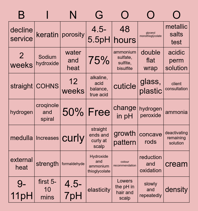 This bingo card has a free space and 48 words: colour recommendation, double flat wrap, elasticity, croqinole and spiral, 12 weeks, ammonia, keratin, first 5-10 mins, glyceryl monothioglycolate, straight ends and curly at scalp, metallic salts test, 4.5-5.5pH, glass, plastic, cuticle, external heat, hydrogen peroxide, 2 weeks, acidic perm solution, reduction and oxidation, 48 hours, ammonium sulfate, sulfite, bisulfite, 50%, decline service, Sodium hydroxide, cream, water and heat, client consultation, 9-11pH, alkaline, acid balance, true acid, COHNS, slowly and repeatedly, change in pH, deactivating remaining solution, strength, hydrogen, growth pattern, concave rods, straight, curly, formaldehyde, medulla, density, porosity, 4.5-7pH, 75%, Hydroxide and ammonium thioglycolate, Increases and Lowers the pH in hair and scalp.