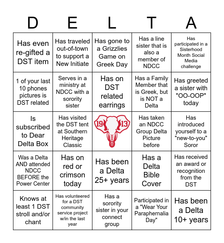 This bingo card has a free space and 24 words: Has on red or crimson today, Has volunteered for a DST community service project w/in the last year, Has on DST related earrings, Knows at least 1 DST stroll and/or chant, Has participated in a Sisterhood Month Social Media challenge, Has even re-gifted a DST item, 1 of your last 10 phones pictures is DST related, Has traveled out-of-town to support a New Initiate, Has taken an NDCC Group Delta Picture before, Has been a Delta 25+ years, Has a Family Member that is Greek, but is NOT a Delta, Is subscribed to Dear Delta Box, Has a Delta Bible Cover, Has received an award or recognition from the DST, Serves in a ministry at NDCC with a sorority sister, Participated in a "Wear Your Paraphernalia Day", Has introduced yourself to a "new-to-you" Soror, Has gone to a Grizzlies Game on Greek Day, Has greeted a sister with "OO-OOP" today, Has visited the DST tent at Southern Heritage Classic, Has been a Delta 10+ years, Was a Delta AND attended NDCC BEFORE the Power Center, Has a line sister that is also a member of NDCC and Has a sorority sister in your connect group.