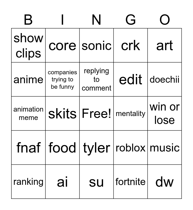 This bingo card has a free space and 24 words: food, ai, replying to comment, ranking, art, show clips, anime, core, mentality, tyler, edit, animation meme, roblox, music, companies trying to be funny, fortnite, win or lose, sonic, doechii, skits, dw, fnaf, crk and su.