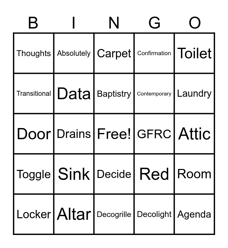 This bingo card has a free space and 99 words: Option, Enclosed, Tile, Carpet, Initiatory, Concrete, Slab, Column, Equipment, Answer, Cold, Hot, Meeting, Decide, Email, Thoughts, Absolutely, No, Yes, Agreed, Consider, Go ahead, Sorry, Review, Approve, Room, Baptistry, Font, Lighting, Outlet, Decogrille, Decolight, Office, Desk, Drains, Door, Window, Sealing, Partition, Sink, Portico, Laundry, Confirmation, Altar, Section, Elevation, Plan, Brainstorm, Today, Meeting, Business, Agenda, Red, Blue, Yellow, Green, Question, Drawing, Conduit, Modules, Break, Proportion, Wireless, Crawl, Drain, Toilet, Structural, Topic, Thanks, Toggle, Rug, Contemporary, Transitional, Traditional, Fire, AV, Data, ADA, Code, GFRG, GFRC, Spire, Crown, Base, Table, Casework, Cart, Egress, Attic, Locker, Pew, Canopy, Frieze, Pedestal, Plumbing, Mechanical, Electrical, Interior and Architecture.