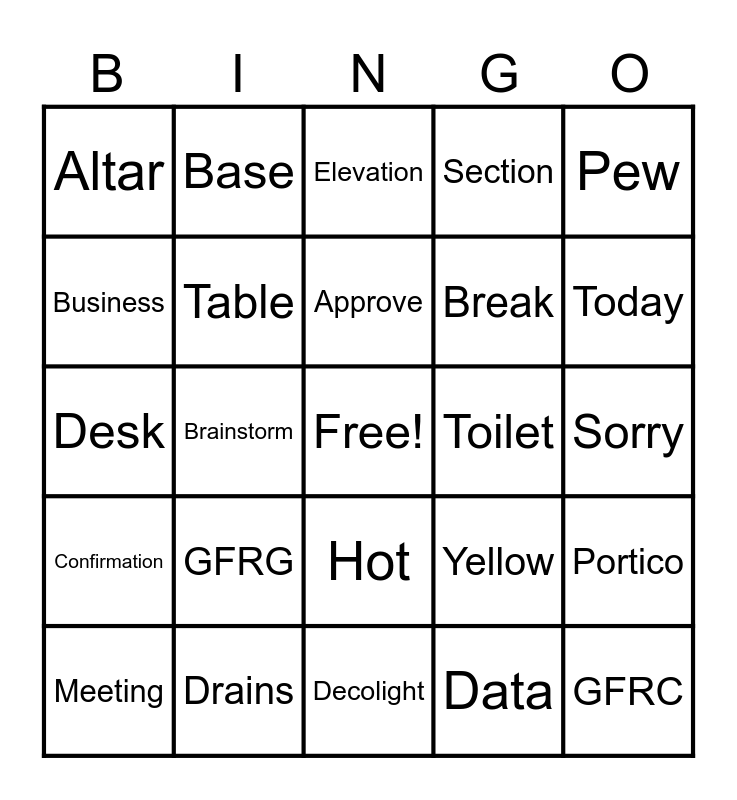 This bingo card has a free space and 90 words: Answer, Cold, Hot, Meeting, Decide, Email, Thoughts, Absolutely, No, Yes, Agreed, Consider, Go ahead, Sorry, Review, Approve, Room, Baptistry, Font, Lighting, Outlet, Decogrille, Decolight, Office, Desk, Drains, Door, Window, Sealing, Partition, Sink, Portico, Laundry, Confirmation, Altar, Section, Elevation, Plan, Brainstorm, Today, Meeting, Business, Agenda, Red, Blue, Yellow, Green, Question, Drawing, Conduit, Modules, Break, Proportion, Wireless, Crawl, Drain, Toilet, Structural, Topic, Thanks, Toggle, Rug, Contemporary, Transitional, Traditional, Fire, AV, Data, ADA, Code, GFRG, GFRC, Spire, Crown, Base, Table, Casework, Cart, Egress, Attic, Locker, Pew, Canopy, Frieze, Pedestal, Plumbing, Mechanical, Electrical, Interior and Architecture.