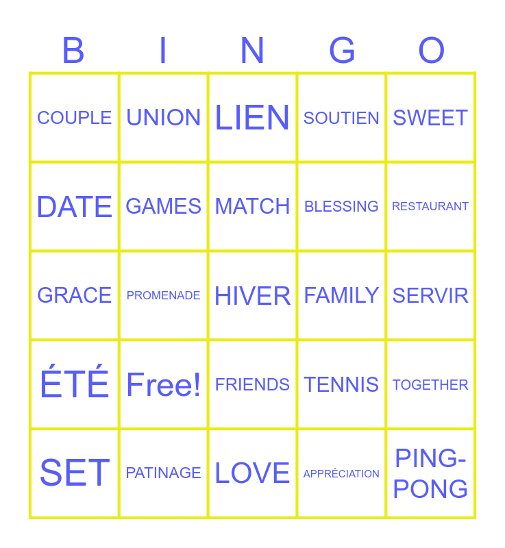 This bingo card has 25 words: Free!, LOVE, MATCH, SET, SWEET, COUPLE, DATE, UNION, FAMILY, FRIENDS, BLESSING, GRACE, TENNIS, TOGETHER, GAMES, PING-PONG, SERVIR, LIEN, RESTAURANT, PROMENADE, HIVER, PATINAGE, ÉTÉ, SOUTIEN and APPRÉCIATION.